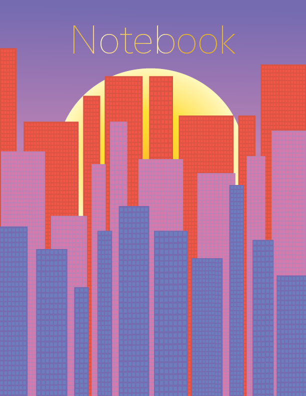 This mock notebook cover shows pattern through its repetition of buildings and windows, which also show texture.